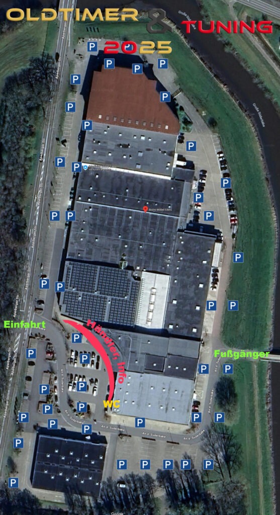 Für euch, die das Gelände noch nicht kennen. Wenn ihr mit dem Auto auf das Gelände möchtet, nutzt bitte die Zufahrt an der Aperberger Straße. Die Einfahrt ist nicht zu übersehen. Von dort weisen wir euch dann ein. Die Bereiche mit den blauen Parkschildern sind für euch reserviert.